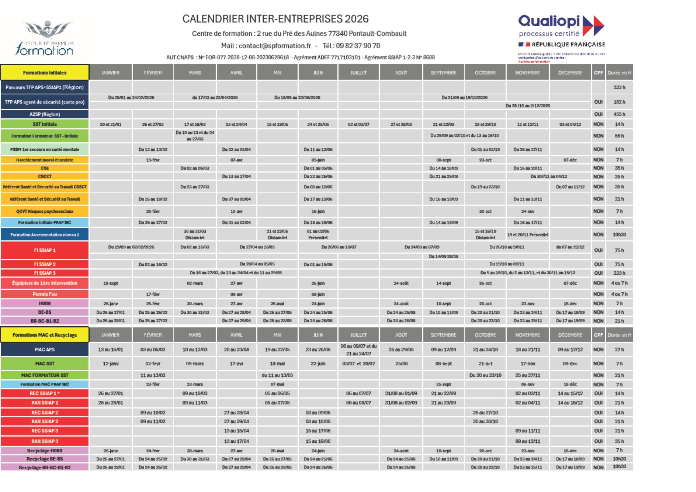 MAC APS Agent de Prévention et de Sécurité sans MAC SST | Du 13 au 16 janvier 2026 | Du 03 au 06 février 2026 | Du 10 au 13 mars 2026 | Du 20 au 24 avril 2026 | Du 19 au 22 mai 2026 | Du 23 au 26 juin 2025 | Du 21 au 24 juillet 2026 | 27 h | |